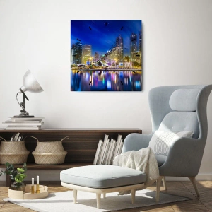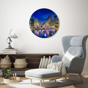 Noche arcoíris de la metrópolis es un reloj de pared extremadamente elegante que llama la atención con su diseño urbano nocturno. La imagen muestra rascacielos iluminados por luces de colores que se reflejan en el agua, creando una vista dinámica e inspiradora. Es el elemento decorativo perfecto para quienes valoran la modernidad y la elegancia.