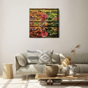 "En el templo de la naturaleza" es un reloj de pared único que nos transporta a la atmósfera de Japón. La esfera muestra una figura sosteniendo un paraguas rojo, caminando entre hojas otoñales. El reflejo en el agua crea un efecto espejo que aporta armonía a toda la composición.