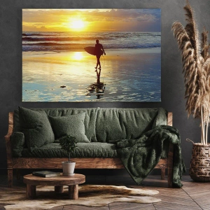Cuadro sobre lienzo - Impresión de Imagen - Un surfista caminando por la playa al atardecer con una tabla en la mano. - 50x70cm - El regreso del guerrero - Decoración de pared moderna para salón y dormitorio ARTTOR