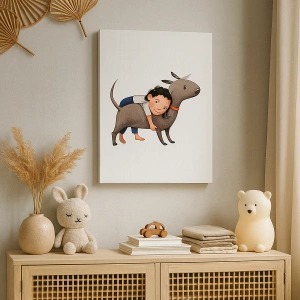 Cuadro sobre lienzo - Impresión de Imagen - Ilustración de estilo de dibujos animados de un niño abrazando a un perro. - 50x70cm - Mejores amigos - Decoración de pared moderna para salón y dormitorio ARTTOR