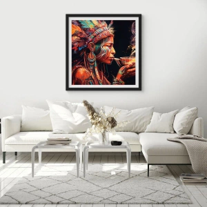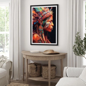 - El póster presenta un impactante retrato de una mujer con un colorido tocado tradicional de plumas. Los ricos colores y los detallados elementos decorativos realzan el carácter místico y simbólico de la imagen, ideal para interiores inspirados en el ar...