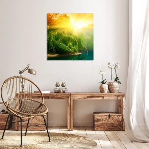 El motivo del bosque verde simboliza renovación, frescura y equilibrio. El cuadro será perfecto como decoración para salones, dormitorios, oficinas o espacios de relax, aportando a los interiores una calidez y energía naturales.