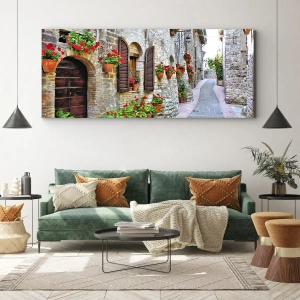Cuadro sobre lienzo - Impresión de Imagen - Una calle estrecha con edificios de piedra decorados con macetas. - 70x50cm - Ambiente italiano - Decoración de pared moderna para salón y dormitorio ARTTOR