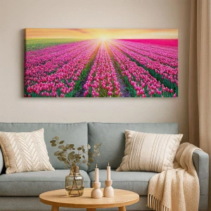 Cuadro sobre lienzo - Impresión de Imagen - Un campo de tulipanes al atardecer - 120x50cm - Granja de belleza - Decoración de pared moderna para salón y dormitorio ARTTOR