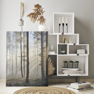 Cuadro sobre vidrio - Impresiones sobre Vidrio - Un bosque en medio de una ligera niebla con rayos de sol brillando a través de los árboles. - 80x120cm - La niebla también está despierta - Decoración de pared moderna para salón y dormitorio ARTTOR