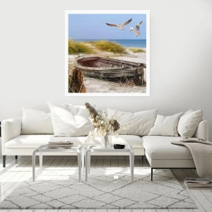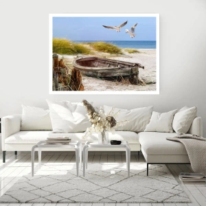 Póster - Un viejo barco en la playa con gaviotas al fondo. - 50x70cm - Bañada por el viento - Decoración de pared moderna para salón y dormitorio ARTTOR