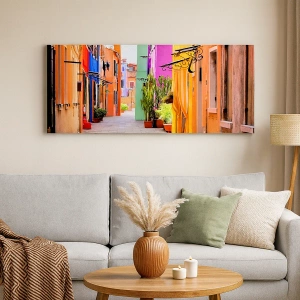 El lienzo "Calle colorida de estilo mediterráneo" es una representación pintoresca llena de calidez y calidez. La calle, rodeada de coloridas casas de vecindad en tonos claros, transmite paz y la atmósfera de un pequeño pueblo. Detalles adicionales, como macetas y balaustradas decorativas, le confieren un carácter único, aportando armonía y calidez al interior.