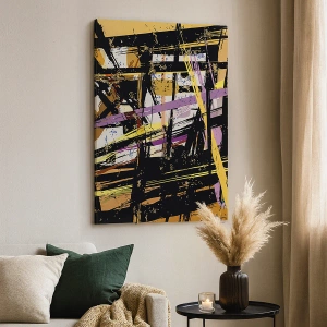 Sharp Cut es una pintura única que llama la atención con su composición abstracta y expresiva. Línea, color y forma se combinan para crear una estructura dinámica, donde el fondo beige contrasta a la perfección con los patrones geométricos negros. Los acentos amarillos y morados aportan profundidad y expresión artística a toda la pieza. La obra encaja a la perfección en el arte moderno, sirviendo tanto como decoración como inspiración.