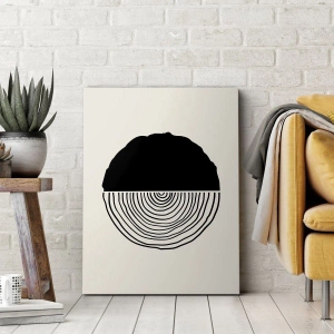 La pintura "Mitad y Mitad" es una composición moderna que combina la simplicidad geométrica con un motivo natural inspirado en una sección transversal de madera. La paleta de colores en blanco y negro introduce armonía y claridad, enfatizando el contraste entre las formas orgánicas y la división simétrica. La obra irradia paz y equilibrio, a la vez que llama la atención por su singularidad.
