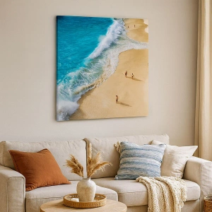 "Y luego el sol, la playa..." es un singular cuadro paisajístico que representa una pintoresca playa con aguas turquesas y gente paseando. Esta sutil composición introduce una atmósfera de relajación, belleza natural y amplitud en el interior. Los delicados tonos de arena y agua se combinan para crear una armonía de colores que deleita con su paz y frescura.