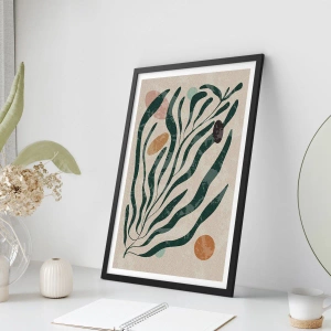 - Un póster moderno con una composición vegetal abstracta en tonos verdes y beige. Líneas delicadas y formas orgánicas crean una decoración sutil que aporta armonía y elegancia natural a cualquier interior. El póster está enmarcado en un marco negro.