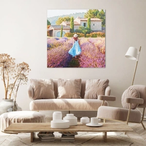 Cuadro sobre lienzo - Impresión de Imagen - Una mujer con un vestido azul caminando por un campo de lavanda con vistas a una casa. - 70x50cm - La chica de la lavanda - Decoración de pared moderna para salón y dormitorio ARTTOR