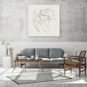 - La pintura representa una escena romántica de un beso sensual entre una pareja, dibujada con líneas delicadas y contorneadas. Su forma minimalista aporta elegancia y expresividad a la obra, integrándose a la perfección en interiores modernos.