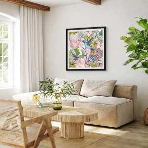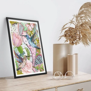 Póster en marco negro - Colibríes coloridos sobre un fondo de flores y patrones. - 50x70cm - Enredado en las vides - Decoración de pared moderna para salón y dormitorio ARTTOR