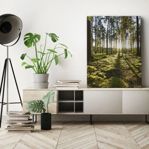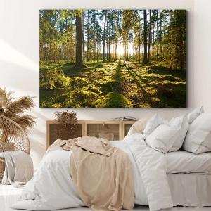Cuadro mural - …Más allá de los siete bosques - Bosque verde iluminado por los rayos del sol sobre el musgo