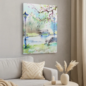 Cuadro sobre lienzo - Impresión de Imagen - Escena de parque de acuarela con bancos y lámparas. - 50x70cm - El encanto del silencio del parque - Decoración de pared moderna para salón y dormitorio ARTTOR