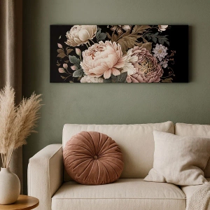 Cuadro sobre lienzo - Impresión de Imagen - Un ramo de flores rosas y mariposas sobre un fondo negro. - 70x50cm - En estilo barroco - Decoración de pared moderna para salón y dormitorio ARTTOR