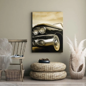El lienzo "Coche clásico de estilo retro con detalles cromados" representa un coche clásico de mediados del siglo XX, que impresiona por su elegancia y la perfección de sus detalles. El cromo brillante y las formas estilizadas le dan a la composición un carácter único, transportando al espectador a la época dorada del automóvil.