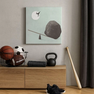 - Esta pintura representa el equilibrio simbólico, con una figura y una roca contra un cielo brillante. Perfecta para interiores modernos. La impresión en lienzo mide 70 x 50 cm.