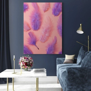 Cuadro sobre vidrio - Impresiones sobre Vidrio - Plumas moradas sobre un fondo rosa en una delicada composición. - 50x70cm - Un pájaro lila del deseo - Decoración de pared moderna para salón y dormitorio ARTTOR