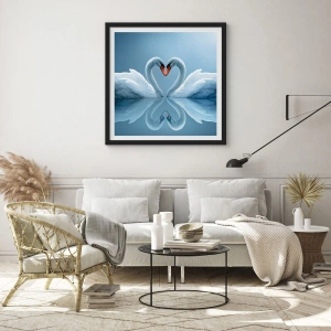 - Este póster muestra dos cisnes formando un corazón sobre aguas tranquilas con un fondo azul. Perfecto para interiores románticos y elegantes. El producto incluye un marco negro de 50 x 70 cm.