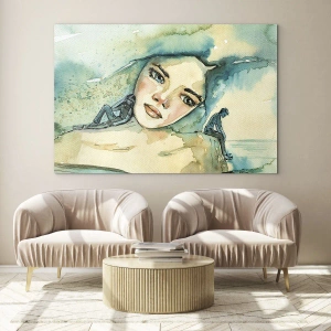 Cuadro sobre vidrio - Impresiones sobre Vidrio - Retrato de una mujer en estilo acuarela con siluetas de figuras. - 70x50cm - ¿Soy azul? - Decoración de pared moderna para salón y dormitorio ARTTOR
