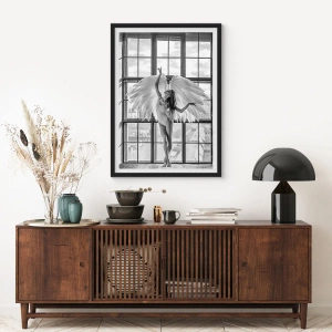 El póster en blanco y negro representa a una mujer con alas de ángel frente a un gran ventanal. Su diseño elegante y sutil lo convierte en la decoración perfecta para un salón, un dormitorio o un espacio artístico.