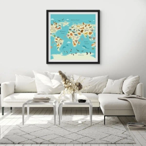 Póster en marco negro - Mapa del mundo con ilustraciones de animales - 70x50cm - Buenos vecinos - Decoración de pared moderna para salón y dormitorio ARTTOR