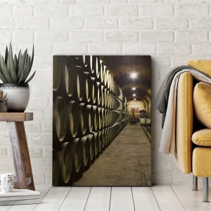 Cuadro sobre lienzo - Impresión de Imagen - Una bodega con barriles de vino de madera dispuestos en filas. - 50x70cm - El placer  - Decoración de pared moderna para salón y dormitorio ARTTOR