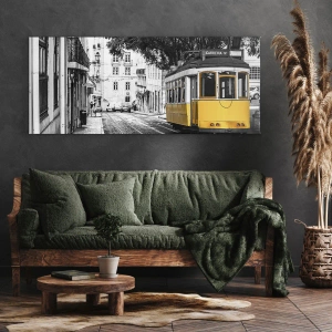 Cuadro sobre lienzo - Impresión de Imagen - Un tranvía amarillo con el telón de fondo de una calle en blanco y negro. - 120x50cm - Y un fado de fondo - Decoración de pared moderna para salón y dormitorio ARTTOR
