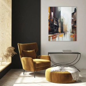 Cuadro sobre vidrio - Impresiones sobre Vidrio - Una calle bajo la lluvia con edificios altos en colores cálidos. - 70x50cm - Día lluvioso - Decoración de pared moderna para salón y dormitorio ARTTOR