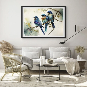 Póster en marco negro - Tres pájaros coloridos en una rama en estilo acuarela. - 70x50cm - ¿Ofendido? - Decoración de pared moderna para salón y dormitorio ARTTOR