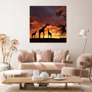 Cuadro mural - Una pequeña cena con seres queridos - Siluetas de jirafas con el sol poniente de fondo en África
