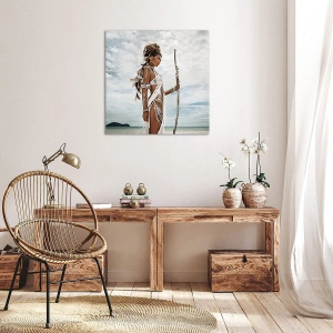 Cuadro sobre lienzo - Impresión de Imagen - Mujer estilizada en la playa con adornos étnicos y un palo. - 70x50cm - Reina de los trópicos - Decoración de pared moderna para salón y dormitorio ARTTOR
