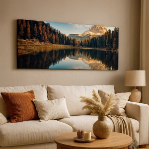 - Una pintoresca vista de un paisaje montañoso con un lago rodeado de bosque. El reflejo del agua aporta armonía y tranquilidad. Una decoración perfecta para una sala de estar o un dormitorio.