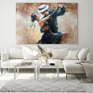 La composición se centra en la pareja bailando en poses expresivas que transmiten emoción y pasión. La ropa estilizada y los detalles sutiles, como el sombrero del hombre, aportan un carácter clásico a toda la escena. El delicado fondo enfatiza la dinámica del movimiento, aportando profundidad y expresión a la imagen.
