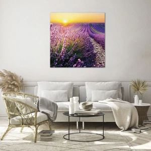 Cuadro sobre vidrio - Impresiones sobre Vidrio - Campo de lavanda al amanecer con un camino rocoso. - 50x70cm - Pradera fragante - Decoración de pared moderna para salón y dormitorio ARTTOR