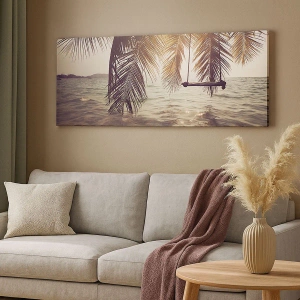 Cuadro sobre lienzo - Impresión de Imagen - Palmera con columpio sobre el agua bajo la luz del sol. - 100x70cm - Columpiar la imaginación - Decoración de pared moderna para salón y dormitorio ARTTOR