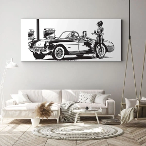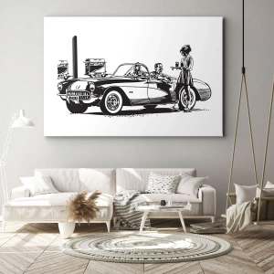 - Este lienzo de 70 x 50 cm representa una escena retro en blanco y negro con un coche clásico y una camarera en patines. Ideal para interiores de estilo vintage, aporta un toque de nostalgia y elegancia, ideal para decorar un salón, una oficina o un dor...