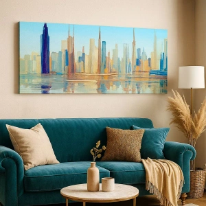 "Metrópolis soleada" es una pintura única que representa una metrópolis moderna en tonos brillantes y soleados. El panorama de la ciudad reflejado en la tranquila superficie del agua crea una composición armoniosa que atrae la mirada y crea una atmósfera de elegancia y paz en el interior. El cielo turquesa contrasta con los colores cálidos de los edificios, aportando a toda la composición una claridad y sutileza excepcionales.