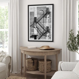 Estilo Industrial es un póster único para los amantes de la estética industrial y los detalles urbanos con un toque rústico. La fotografía muestra una escalera metálica de incendios contra una fachada de ladrillo, creando un eficaz juego de luces y sombras y una composición dinámica de formas geométricas.