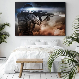 Esta pintura es perfecta como decoración para oficinas, estudios o espacios de estilo industrial. Su carácter masculino y estilo expresivo aportarán fuerza y determinación a cualquier interior. También es un regalo ideal para entusiastas militares o personas relacionadas con el ejército. La impresión de alta calidad sobre lienzo garantiza la solidez del color y la resistencia a la decoloración. Su sólida construcción y fácil montaje hacen que la pintura esté lista para colgar inmediatamente después de la compra. Su estilo y temática únicos llaman la atención y se convierten en el centro de atención de cualquier estancia. Encarga la pintura "Soldado en acción con un fusil" para añadir un carácter dinámico y moderno a tu interior. Esta decoración única encantará tanto a los entusiastas del arte como a los militares, combinando estética con un mensaje contundente.