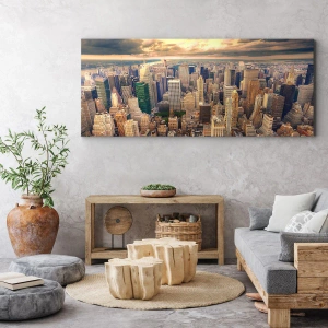 Cuadro sobre lienzo - Impresión de Imagen - Panorama de la ciudad con vistas a los rascacielos al atardecer - 70x50cm - Metrópolis dorada - Decoración de pared moderna para salón y dormitorio ARTTOR