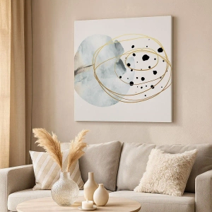 Gracias a su estética universal, "En los abrazos del espacio" quedará genial como decoración en un salón, dormitorio u oficina. Los patrones geométricos combinados con detalles dorados atraen la mirada con sutileza, convirtiendo esta pintura en el complemento perfecto para cualquier interior. Su simplicidad y elegancia crean una atmósfera única.