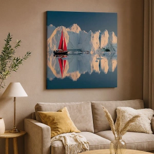- La pintura representa un velero con una vela roja frente a un impresionante glaciar, reflejado en las tranquilas aguas. Un paisaje deslumbrante con una estética armoniosa que transporta la paz y la belleza de la naturaleza al interior.
