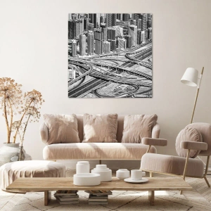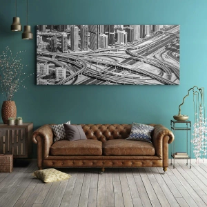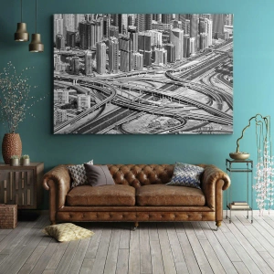 - La pintura representa una vista en blanco y negro de Dubái, mostrando modernos rascacielos y una compleja red vial. Es una opción ideal para interiores modernos, ya que transmite una atmósfera metropolitana y una estética inspiradora.