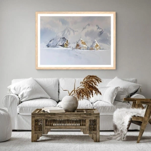 - Este póster representa un pintoresco paisaje invernal con una cabaña y un pajar sobre un fondo montañoso. Sutiles tonos pastel y un paisaje tranquilo crean una atmósfera única de armonía.