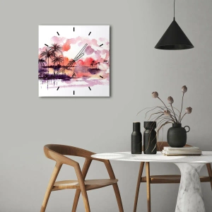 - Este reloj de pared presenta un paisaje de acuarela con palmeras al atardecer. Los cálidos tonos rosa y morado crean una composición armoniosa, perfecta para interiores con estilo.
