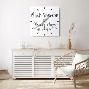 La inscripción motivacional «Piensa en positivo y las cosas positivas sucederán» es el motivo principal de este singular reloj de pared. Fabricado en cristal de 30 x 30 cm, el reloj combina minimalismo y modernidad, aportando un toque inspirador al interior.