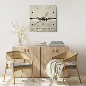 Reloj de pared - Reloj de vidrio - Avión histórico en el aeropuerto en sepia - 30x30cm - Como siempre, preparado - Decoración de pared moderna para salón y dormitorio ARTTOR